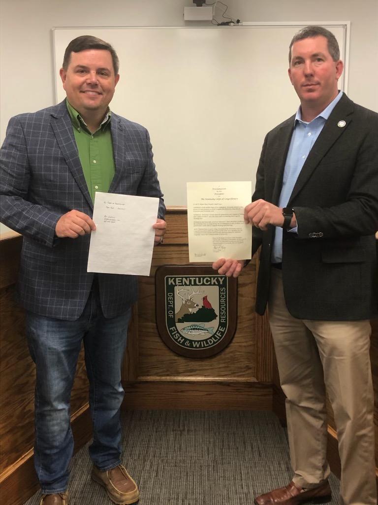 On Nov. 9, 2021, Rep. Koch (right) presented the Corps Proclamation supporting a Flintlock only deer season to Kentucky Fish & Wildlife Commissioner Rich Storm (left).